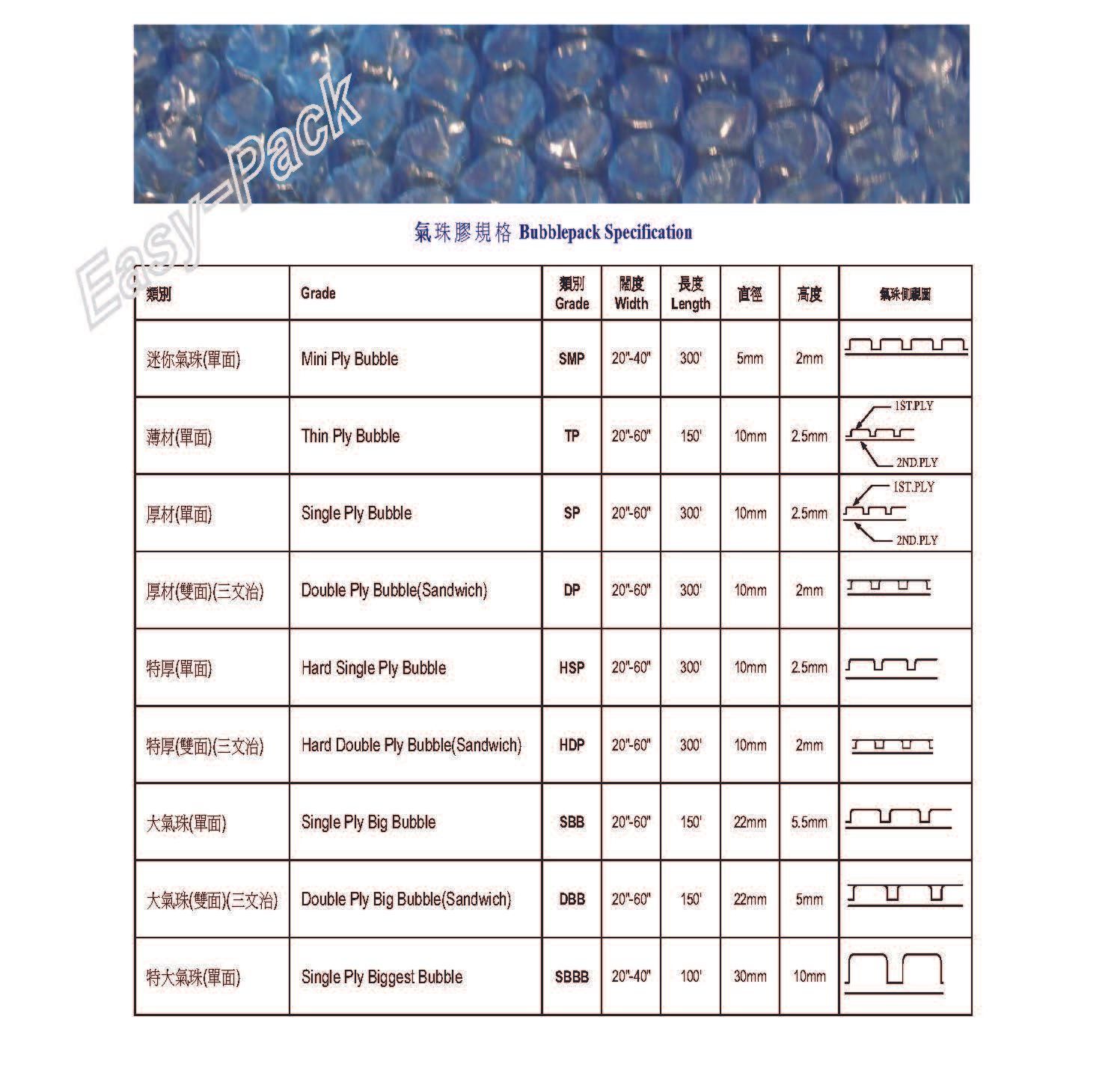 氣珠膠分為單面及雙面不同種類, 單面為凹凸獨立型氣泡組成, 雙面氣珠膠上下兩層薄膜夾著中間氣泡形成三文治式, 保護力較全面。大、細氣珠膠含氣量不同, 大氣珠膠含氣量特多, 防震力強, 適合體積較大的重量級包裝, 保護力較全面; 細氣珠膠適合細面積包裝, 節省儲存空間, 更特別提供迷你氣珠膠, 適合特小型包裝. 迷你氣珠膠因曲線太多, 不設雙面。為了迎合郵寄包裹或送遞樣辦的需要而設的薄材氣珠膠, 可以提供保護及包裝作用。薄材氣珠膠重量較輕, 可以節省郵寄費用, 並可減輕某部份客戶成本負擔。各類氣珠膠可複合其他材料加添保護性及美觀性, 例如:複合鋁膜及珍珠棉, 紙張等。